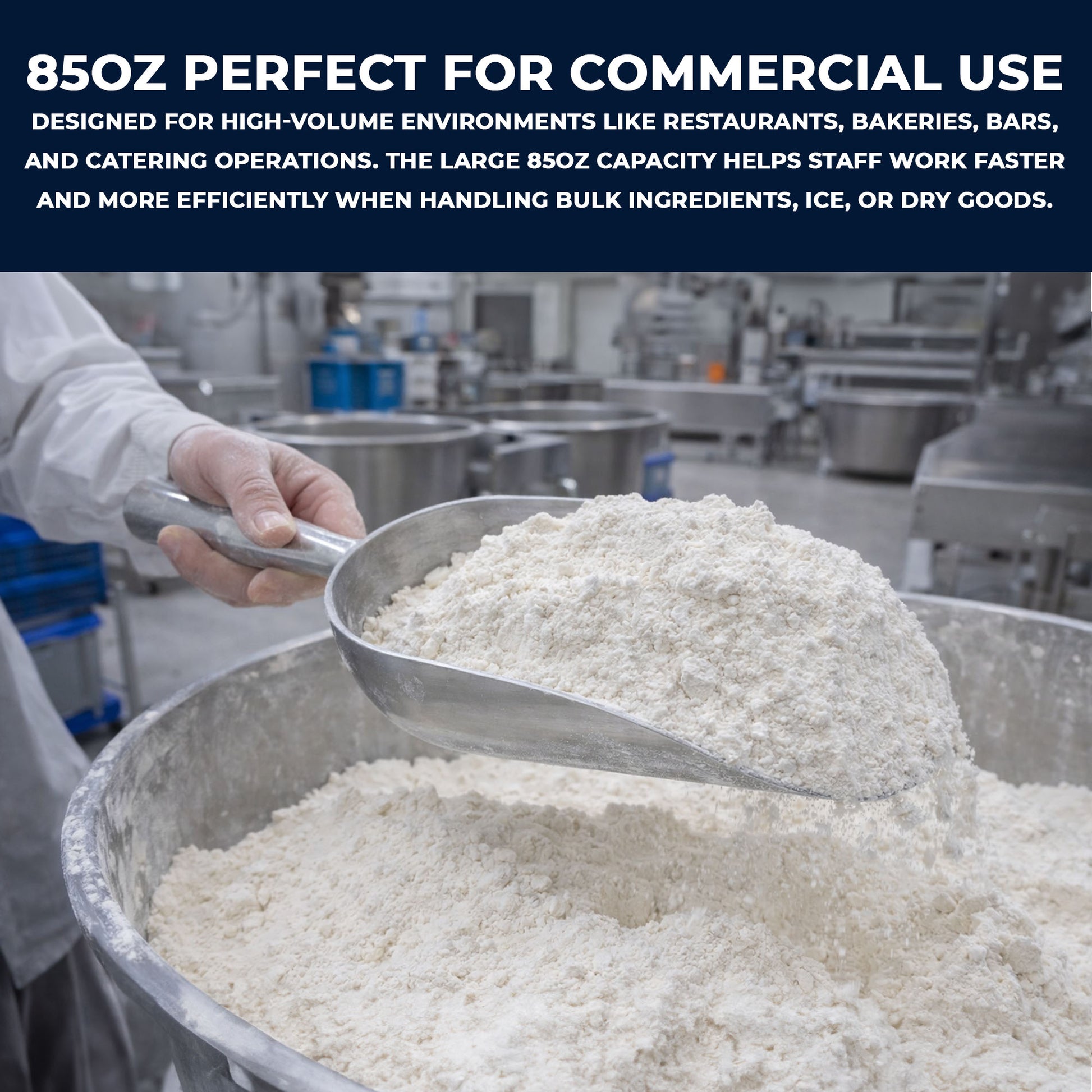 Multipurpose metal scoop available in multiple capacities including 5oz, 12oz, 24oz, 38oz, 58oz and 85oz