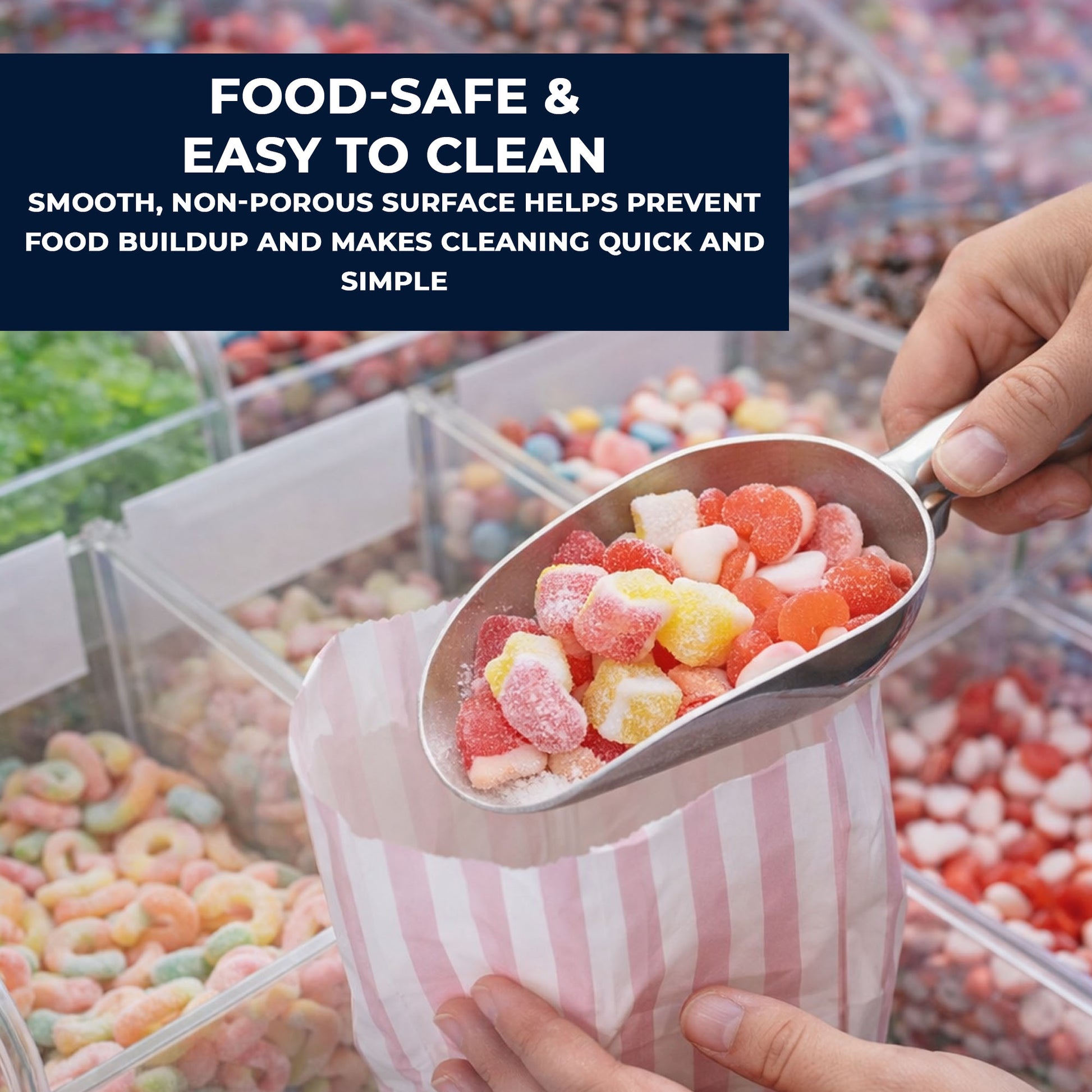 A smooth metal surface makes cleaning quick and simple. The scoops are easy to rinse and wipe clean after use, helping maintain hygiene in busy kitchen environments.